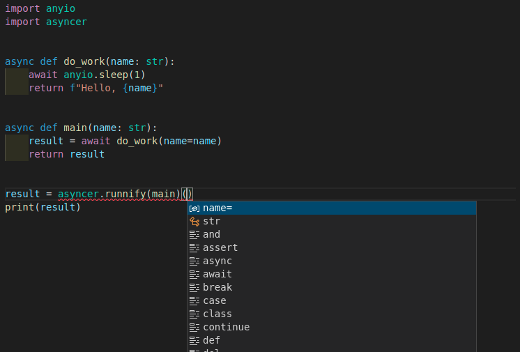 If you run that, you will see the expected result, almost the same as with AnyIO, it will wait for 1 second and then print Hello, World